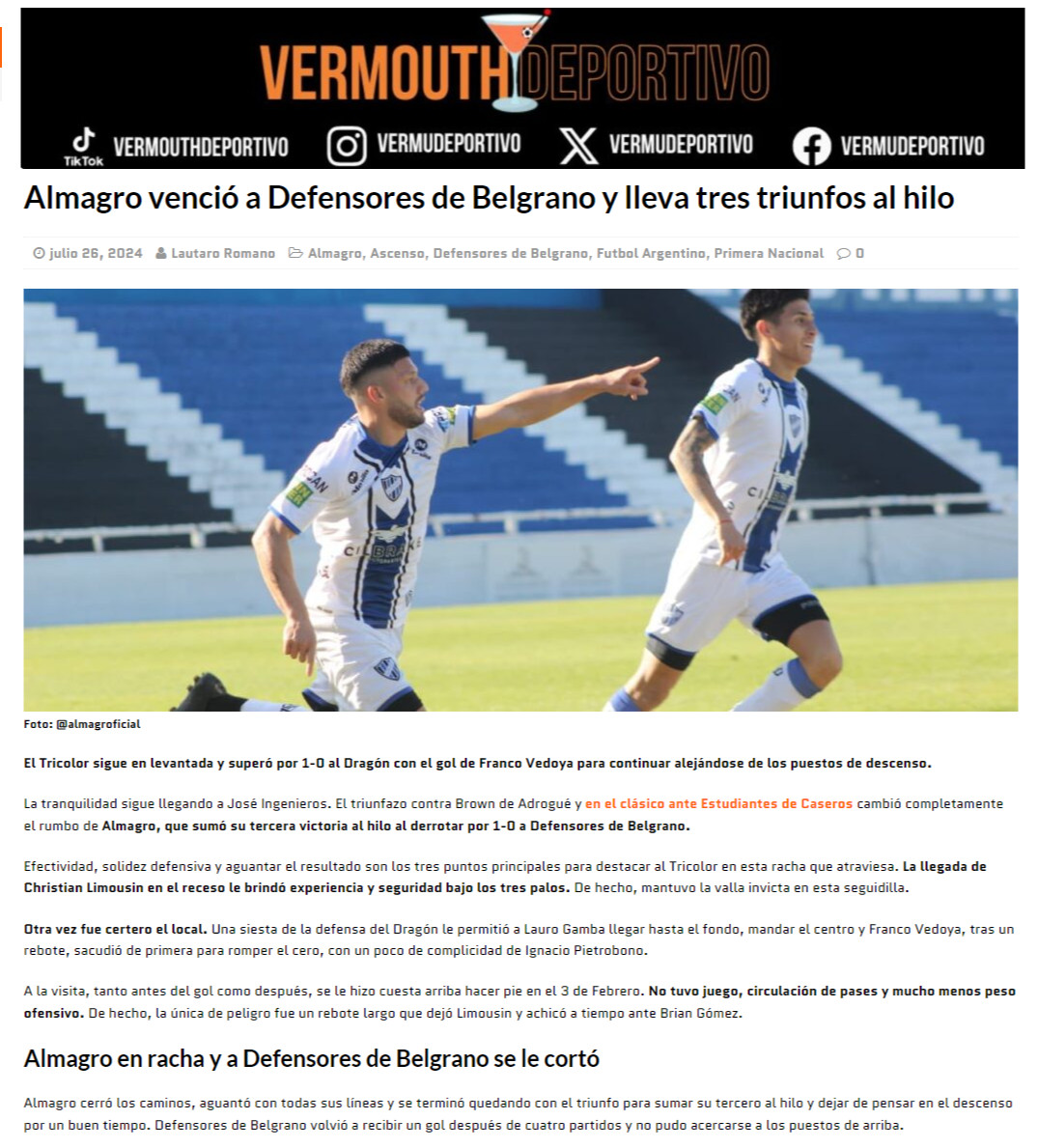 Previous Image Next Image 2024 – Primera Nacional – Almagro vs Defensores de Belgrano – Vermouth Deportivo