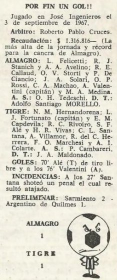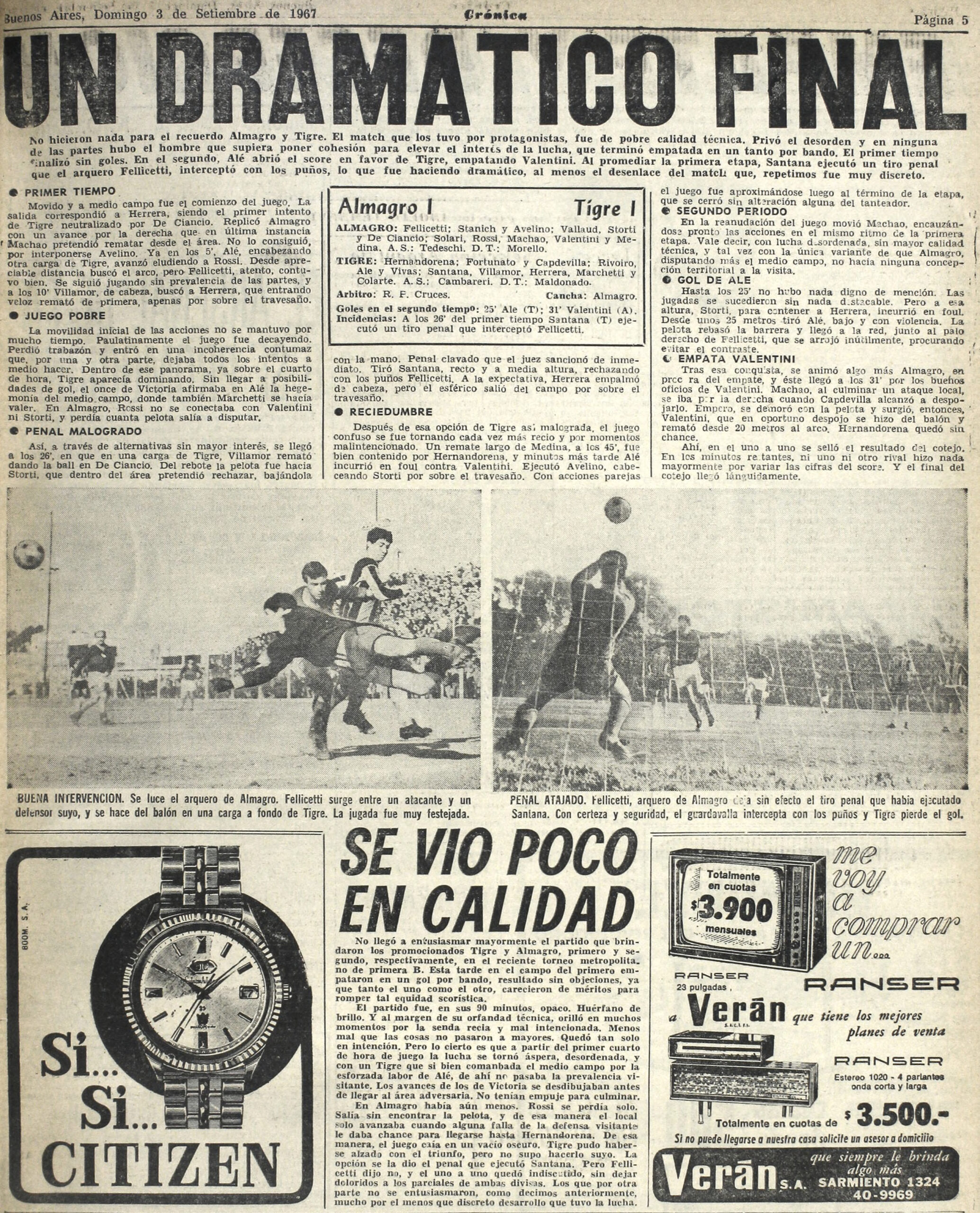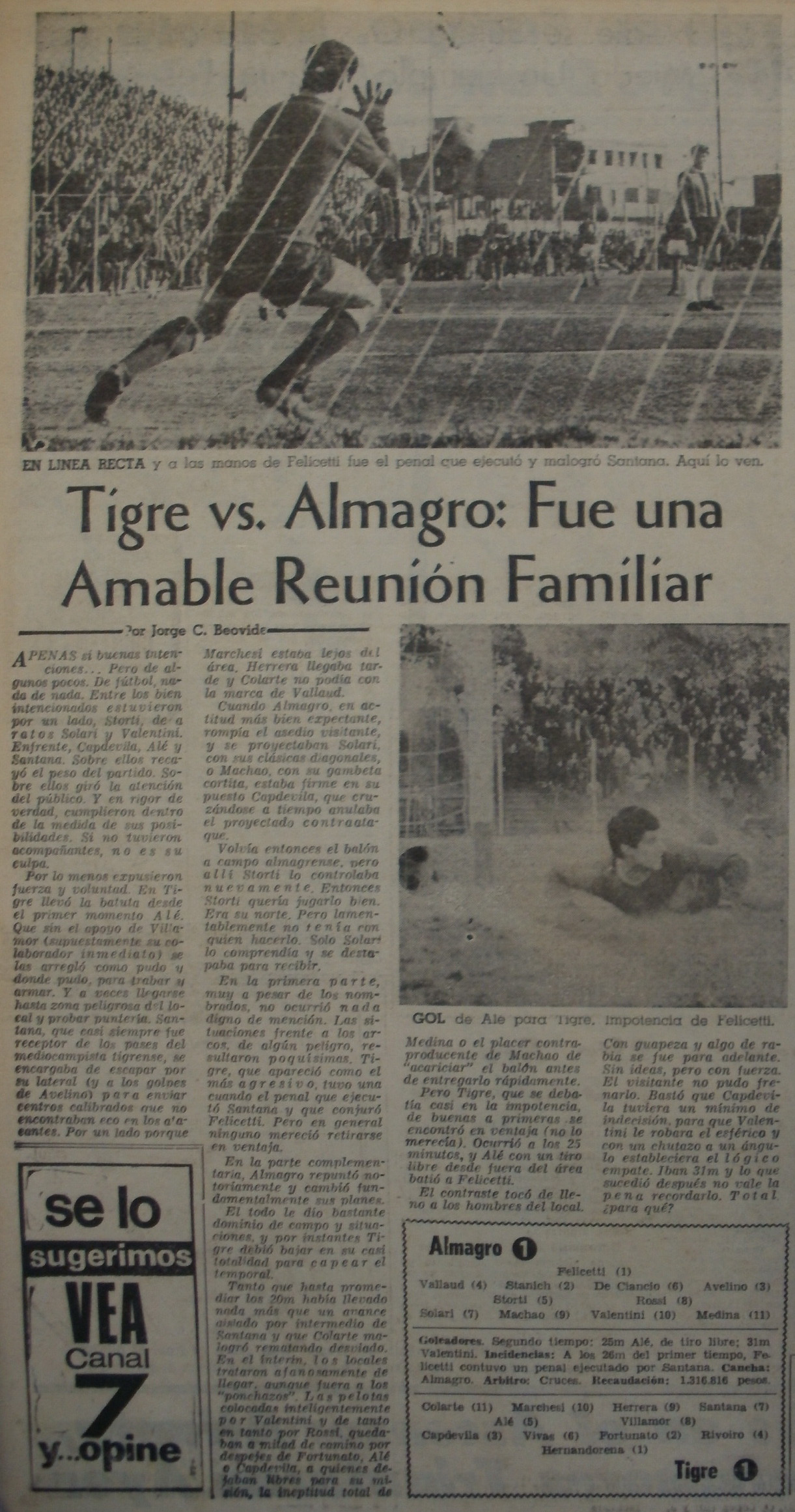 Almagro vs. Tigre (1-1), con gol de Santiago Fris Ale y Albino Pascual Valentín. Vistas generales de los equipos saliendo al campo de juego. Vistas generales del público en la tribuna y tirando papelitos al campo de juego. Secuencias breves del partido. Vistas generales del público en las tribunas y en las plateas. Vistas generales de la jugada donde el arquero Luis Antonio Felicetti le ataja un penal a Carlos Luis Santana. (Sin sonido) (4º Jornada Torneo de Reclasificación) Código del film: B-03812 Copyright Archivo DiFilm – Consultas por material de archivo difilm@sinectis.com.ar – http://www.difilm-argentina.com –